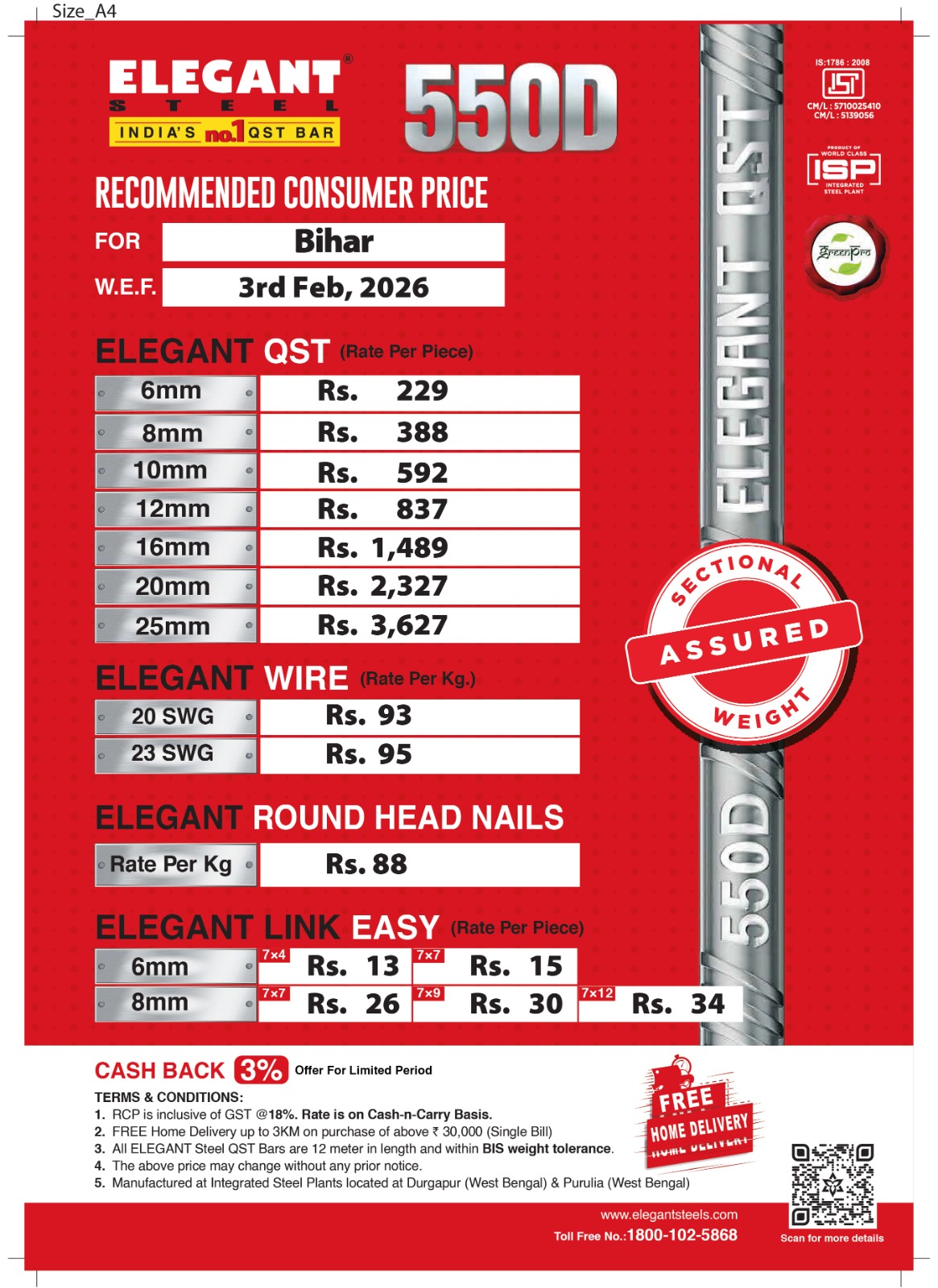 In comparison to other TMT bar manufacturers and suppliers, we always supply every item at a reasonable price go check today elegant TMT bar price search “elegant tmt bar price list today. To know the price of individual items based on dimensions or quantity, download the pricing chart produced for different states (Assam, Bihar, Punjab, Rajasthan, Tripura, West Bengal, Haryana, Jharkhand). To make your journey with us more convenient, we provide free home delivery up to 3 Km on orders of Rs 30,000 or more on a Single bill.